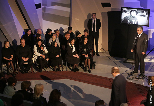Генеральный директор Всероссийской государственной телевизионной и радиовещательной компании (ВГТРК) Олег Добродеев (справа) на церемонии прощания с журналистом ВГТРК Антоном Волошиным в студии программы "Специальный корреспондент". Антон Волошин погиб во время минометного обстрела под Луганском.