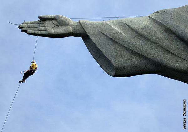 Рабочий спускается с руки статуи Христа в Рио-де-Жанейро.