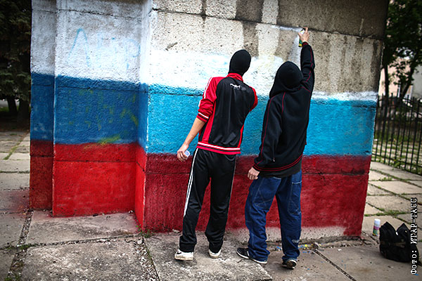 Луганские подростки разукрашивают опору в цвета российского флага.