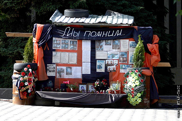 Стенд памяти на площади в Луганске.