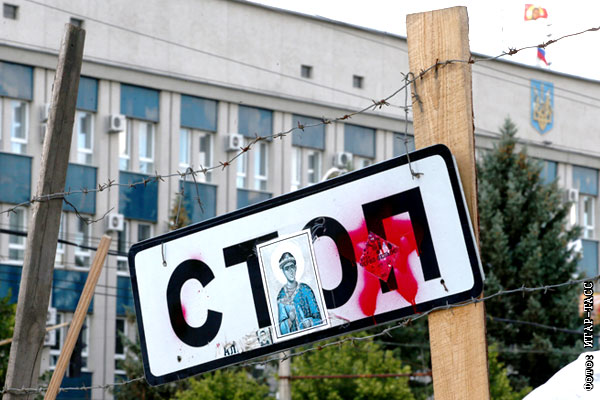 Забор из колючей проволоки, знак "Стоп" и икона на площади перед зданием СБУ в Луганске.