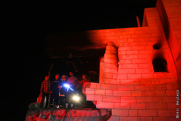 Пожарные и местные жители осматривают развалины одного из домов предполагаемых похитителей израильских детей.
