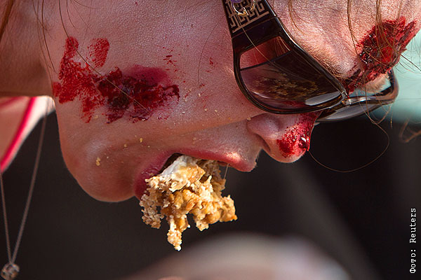 Зомби по имени Молли в очках от D&G принимает участие в конкурсе по поеданию "мозгов". В этот день Молли шла на рекорд, ей удалось затолкнуть в себя около двух с половиной кг свиного деликатеса.