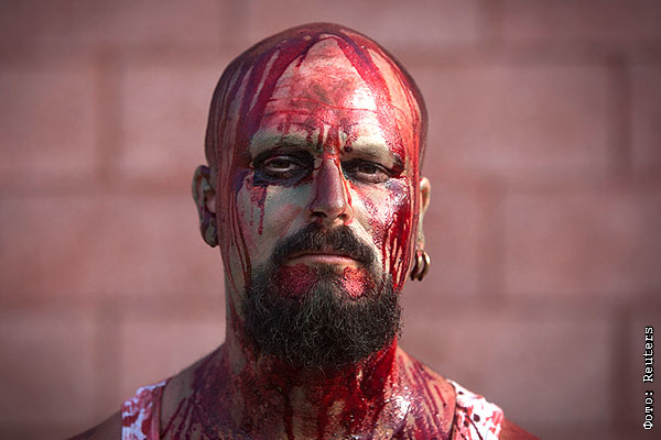 Этот участник зомби-праздника просто решил, что крови много не бывает.