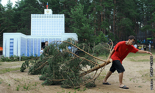 Участник молодежного образовательного форума "Селигер-2011" убирает территорию после урагана.