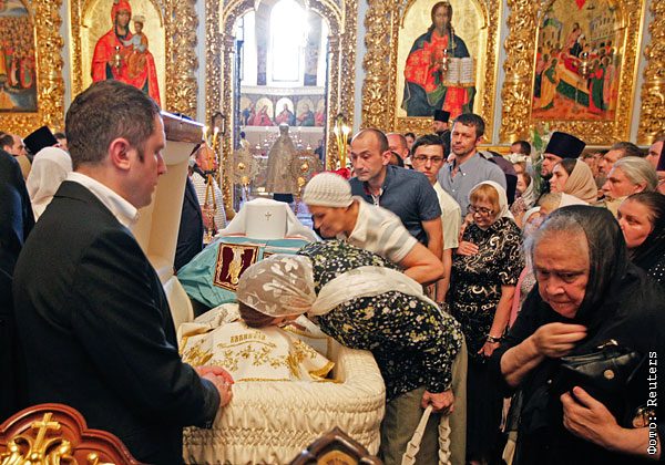 Верующие во время прощания с митрополитом Владимиром в Успенском соборе Киево-Печерской Лавры.
