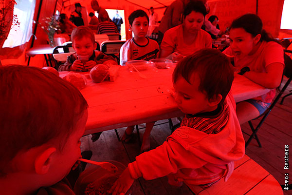 Обед в полевой столовой лагеря для беженцев с Украины.