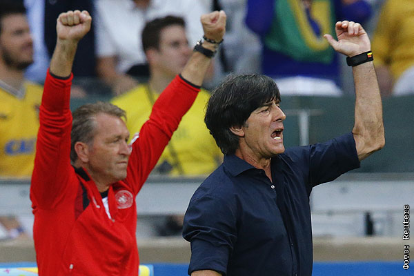 Тренер сборной Германии Йоахим Лев и тренер вратарей Андреас Кепке считают голы.