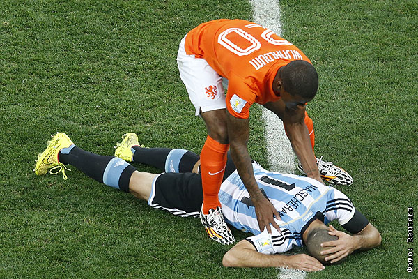 Голландский игрок Вейналдум склонился над травмированным аргентинцем Маскерано.
