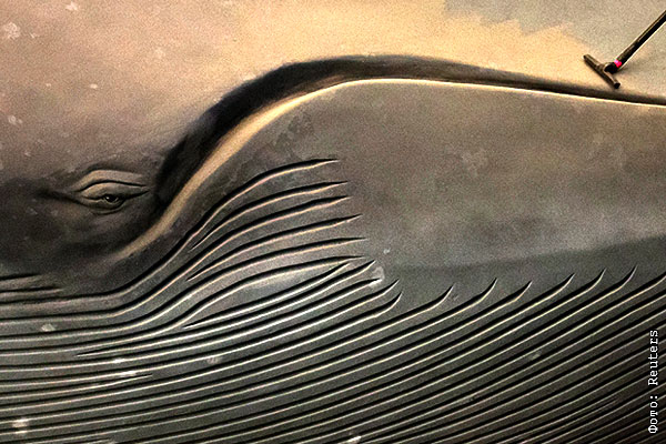 Сотрудник моет шваброй модель голубого кита в американском музее естественной истории на Манхэттене.