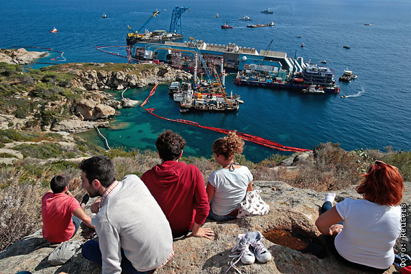 Круизный лайнер "Коста Конкордиа" с 4,2 тысячей пассажиров на борту налетел на риф у итальянского острова Джильо в январе 2012 года и с тех пор лежал на мели. Утром в понедельник у западного побережья Италии началась операция по поднятию судна со дна моря.