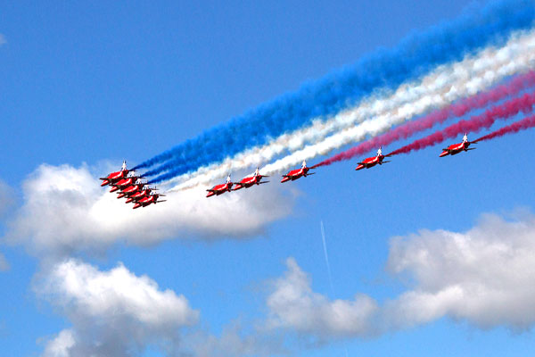 Пилотажная группа истребителей ВВС Великобритании под названием "Red Arrows" (Красные Стрелы).