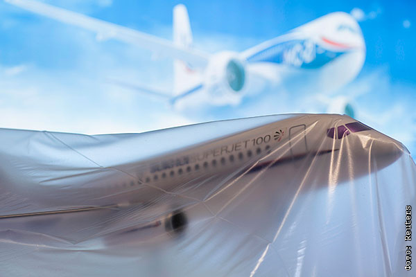 Зачехленный стенд производителя Sukhoi Superjet SSJ-100 на "Фарнборо-2014".