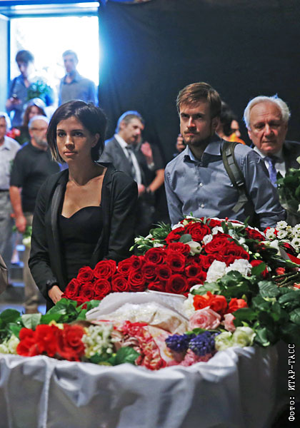 Участница панк-группы Pussy Riot Надежда Толоконникова и ее супруг активист арт-группы "Война" Петр Верзилов (в центре) на церемонии прощания с Валерией Новодворской.