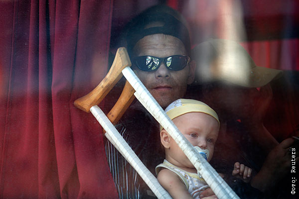Мужчина с ребенком на руках смотрит из окна автобуса, уезжающего в Россию.