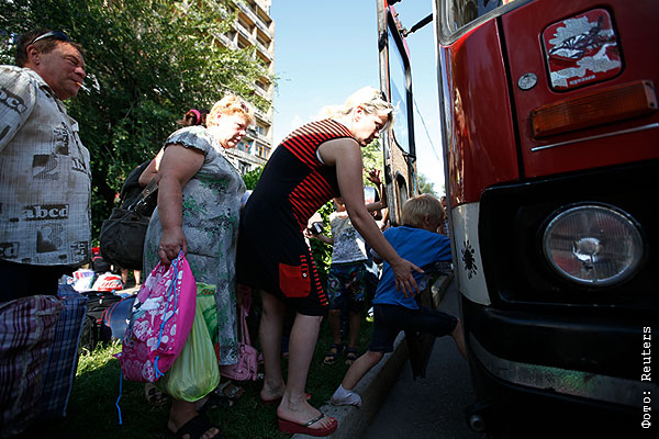 Жители Донецка садятся в автобус.