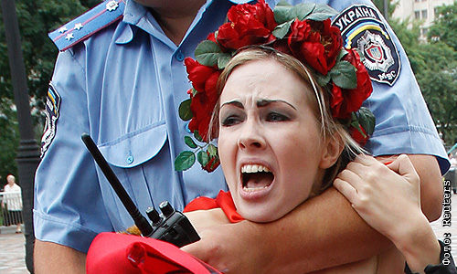 Одна из лидеров движения FEMEN Александра Шевченко сказала журналистам, что этот протест направлен против пенсионной реформы, которая дискриминирует права украинских женщин, "многие из которых просто не доживут до пенсионного возраста".