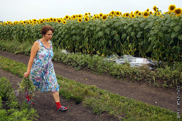 Местная жительница несет букет полевых цветов к месту падения самолета.