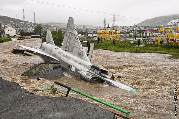 Реактивный самолет-памятник Су-24, смытый в реку после прошедших ливней.