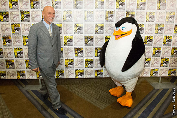 Джон Малкович подходит к пингвину Шкиперу. В новом мультфильме "Пингвины Мадагаскара" он озвучивает Дэйва.