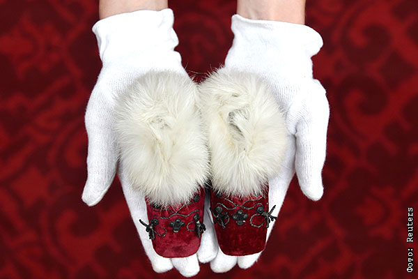 Экспонат британской выставки "Королевское детство" - бархатные пинетки, отороченные мехом, принадлежавшие в свое время маленькому Эдуарду VII.