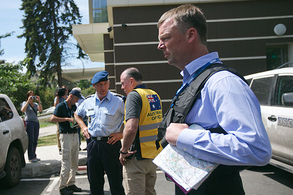 Заместитель руководителя специальной миссии наблюдателей ОБСЕ на Украине Александр Хаг у отеля.