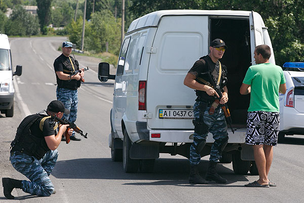 Сотрудники подразделения милиции ДНР "Беркут" на въезде в Шахтерск.