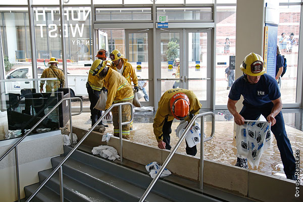 Пожарные сооружают плотину чтобы перегородить путь воде на нижние этажи.