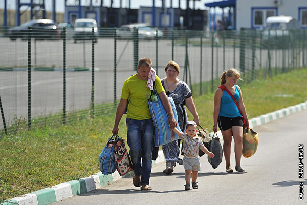 Беженцы из городов юго-востока Украины во время пересечения украинско-российской границы на многостороннем пункте пропуска "Донецк".