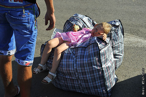 Девочка отдыхает на сумках с вещами в ожидании проезда через границу.