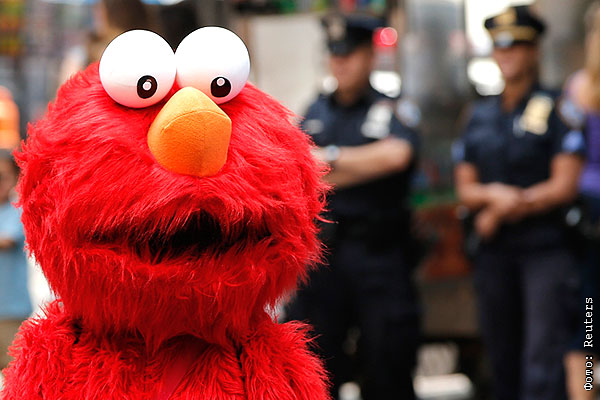 Элмо немного удивлен, он не на улице Сезам, а на Таймс-сквер, и вокруг полицейские.