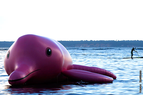 Надувная резиновая фигура амазонского речного дельфина в районе пляжа Понта Негра на Амазонке. Активисты организации Red Alert пытаются таким образом привлечь внимание общественности к проблеме исчезновения речных дельфинов.