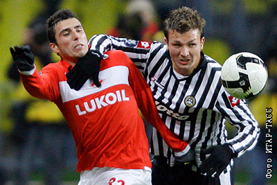 Спартаковец Никита Баженов и игрок "Удинезе" Марко Мотта (слева направо) в матче группового этапа кубка УЕФА по футболу: "Спартак" (Москва) - "Удинезе" (Италия) – 1:2