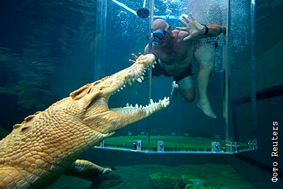 В океанариуме "Сrocosaurus Сove" открылся необычный аттракцион. Желающих помещают в стеклянную клетку и погружают в бассейн с огромным морским крокодилом