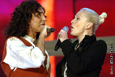 Певцы Валерий Леонтьев и Лайма Вайкуле во время выступления на концерте "Легенды Ретро FM"