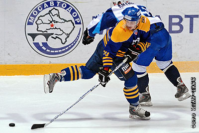Игроки "Атланта" Сергей Мозякин (на первом плане) и "Динамо" Андрей Антонов (на втором плане) в матче чемпионата КХЛ: "Атлант" (Московская область) – "Динамо" (Минск)