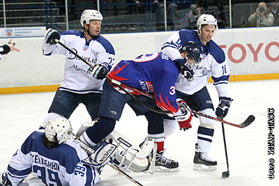 Игроки "Металлурга" Денис Платонов (в синей форме) и "Динамо" вратарь Вадим Желобнюк, Алексей Житник и Петр Чаянек (в белой форме слева направо) в матче чемпионата КХЛ: "Металлург" (Магнитогорск) – "Динамо" (Москва) – 4:3. Фото ИТАР-ТАСС