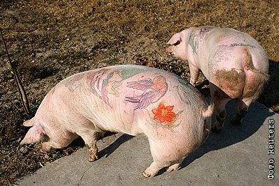 Вим Дельвуа держит арт-ферму в Китае, выращивает на ней свиней и делает им татуировки. Ранее выставка Вима Дельвуа и его свиней была запрещена в Шанхае