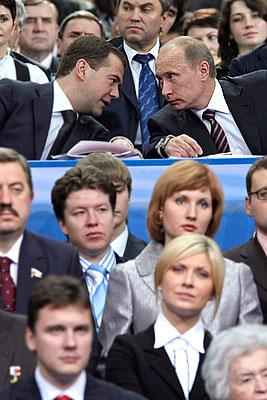 Президент РФ Дмитрий Медведев и премьер-министр РФ Владимир Путин на съезде партии "Единая Россия"