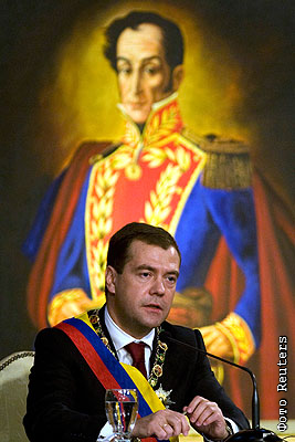 Дмитрий Медведев во время подписания совместных документов по итогам российско-венесуэльских переговоров в президентском дворце "Мирафлорес"