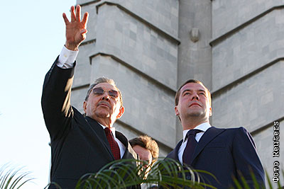 Председатель Госсовета и Совета министров Кубы Рауль Кастро и президент России Дмитрий Медведев во время возложения венка президентом РФ к памятнику Хосе Марти на площади Революции