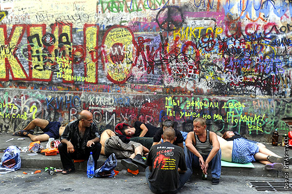 Стена Виктора Цоя на Старом Арбате в день 20-й годовщины гибели музыканта.