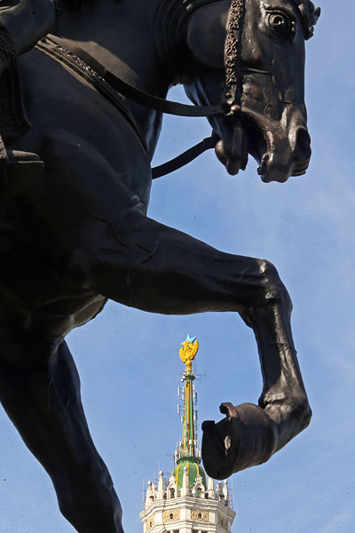 Неизвестные вывесили украинский флаг на шпиле сталинской высотки, расположенной на Котельнической набережной, а также выкрасили половину звезды, венчающей шпиль, в голубой цвет.
