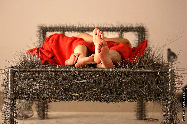 Китайская художница Чжоу Цзе (Zhou Jie) спит со своим парнем на кровати из металлических прутьев. Проект называется "36 дней", именно столько девушка должна провести в изолированном пространстве, днем она мастерит железную кровать, а ночью спит на ней.