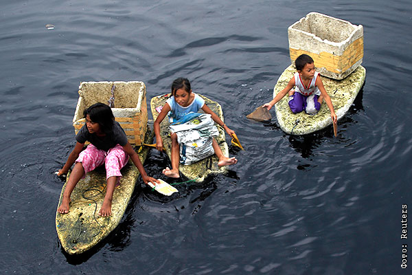 Филиппинские дети плавают на самодельных суденышках из пенопласта и достают из воды пластиковый мусор, который потом сбывают в спецмагазинах по 2 цента за кг.
