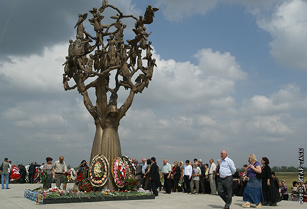 Люди у монумента "Древо скорби" на кладбище "Город ангелов", где похоронены жертвы теракта 1-3 сентября 2004 года в школе №1.