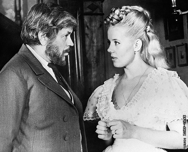 Съемки ленты "Вооружен и очень опасен" по мотивам произведений Френсиса Брета Гарта (режиссер Владимир Вайншток). Людмила Сенчина в роли Жюли Придом и Донатас Банионис в роли Габриэля Конроя, 1977 год.