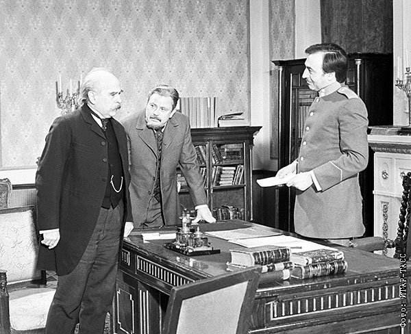 Съемки советско-польского фильма "Феликс Дзержинский" (режиссер Анатолий Бобровский). Слева направо: Януш Клосиньски в роли Норовского, Донатас Банионис в роли Гартинга и Валентин Кулик в роли Зираха на съемочной площадке, 1978 год.