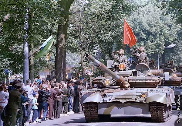 Российские войска проходят прощальным парадом по улицам Вюнсдорфа. Снимок сделан 11 июня 1994, 5 сентября того же года Германию покинул последний российский военнослужащий.