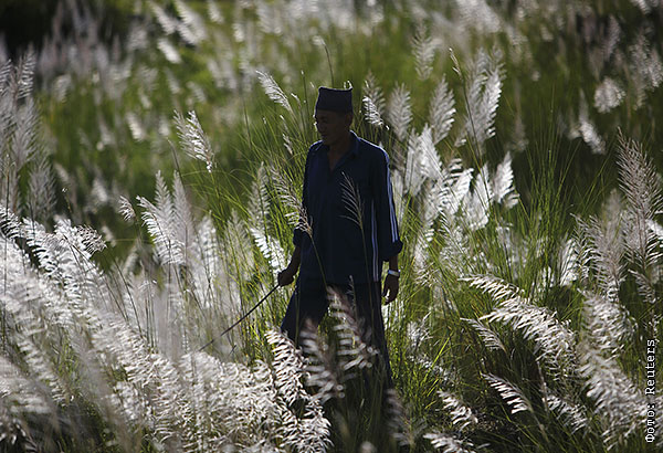 Мужчина бредет по полю за своим стадом. Катманду.